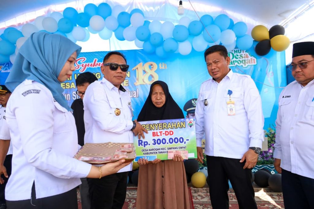 Peringatan HUT Desa Baroqah tahun ini ditandai dengan pemotongan tumpeng, penyerahan santunan anak yatim, dan penyaluran Bantuan Langsung Tunai (BLT).