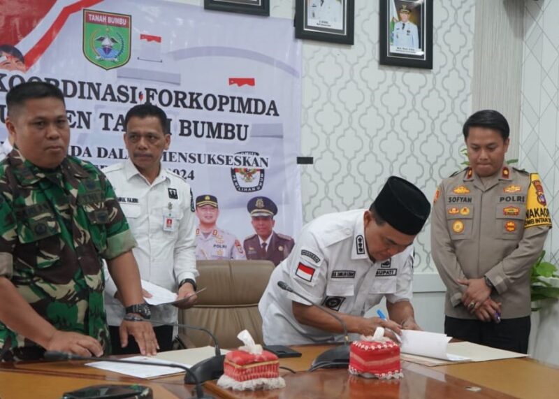 Penandatanganan oleh Bupati Tanbu Zairullah Azhar dengan pihak Polres dan Kodim 1022 Tanbu, Rabu (6/3/2024) di Batulicin.