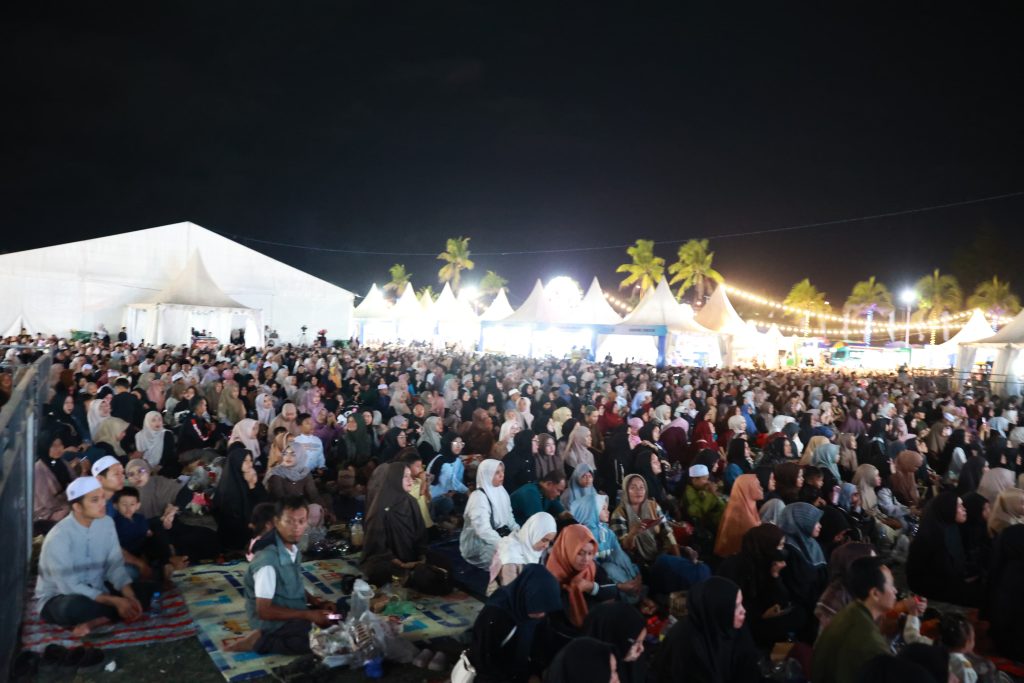 Suasana khidmat menyelimuti sepanjang acara, di mana para jamaah tampak antusias mendengarkan tausiyah meski di tengah kerumunan yang padat.